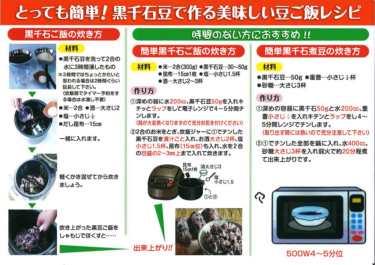 | 簡単調理法 | お米と一緒に炊いたり、煮豆としても美味しくお召し上がりいただけます。 |